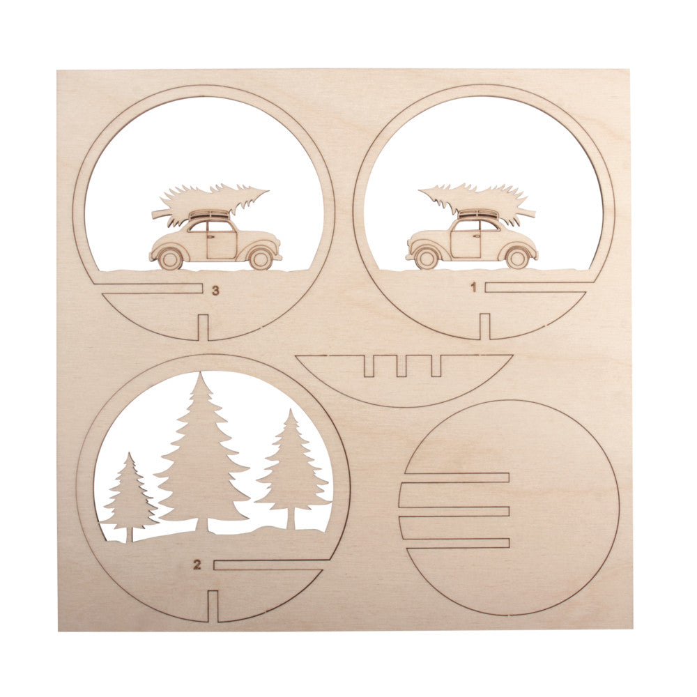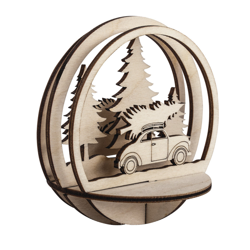 Houten steekdelen bomen en auto met Kerstboom op het dak.