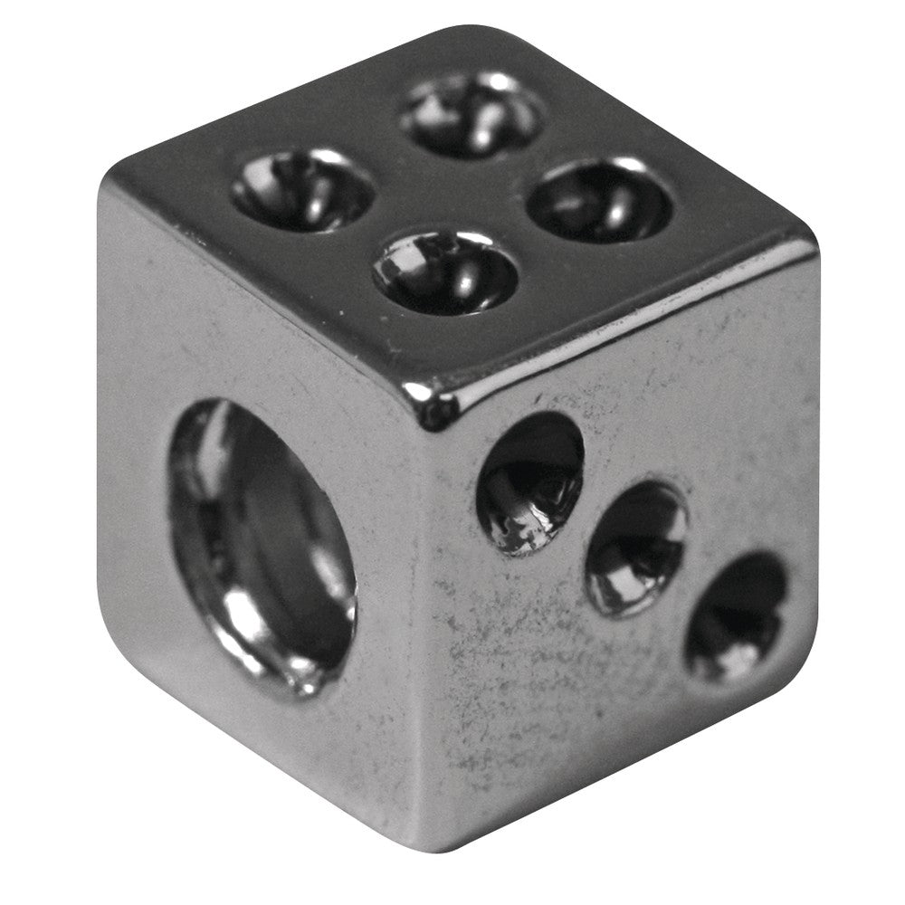 Metalen kraal/sierelement in de vorm van een dobbelsteen.