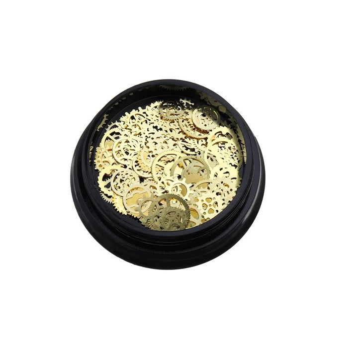 Doosje met goudkleurige steampunk onderdeeltjes.